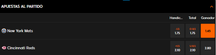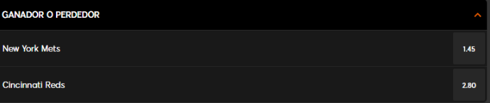 Mientras más baja sea la cuota, las ganancias serán más bajas, pero las probabilidades de ganar podrían aumentar. Como ejemplo, tomaremos el partido Mets vs Reds, bajo los momios de 888Sport. Estos son los pasos para apostar:
