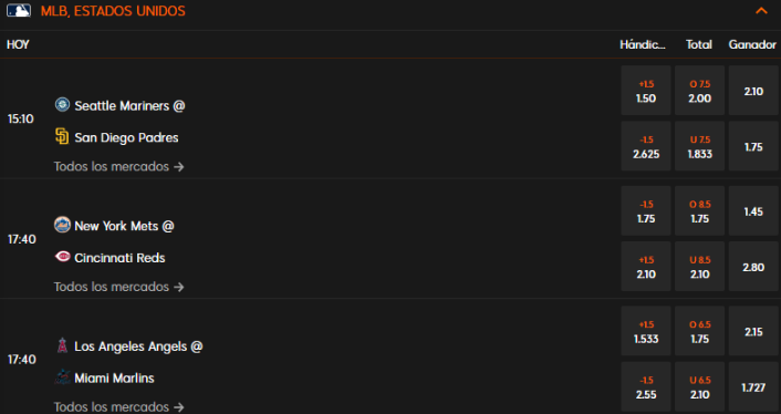 Aquí, puedes elegir carreras de ventaja o desventaja para un equipo, dependiendo del grado de favorito. Un hándicap -1.5 para un equipo, indica que deberá ganar por al menos dos carreras.